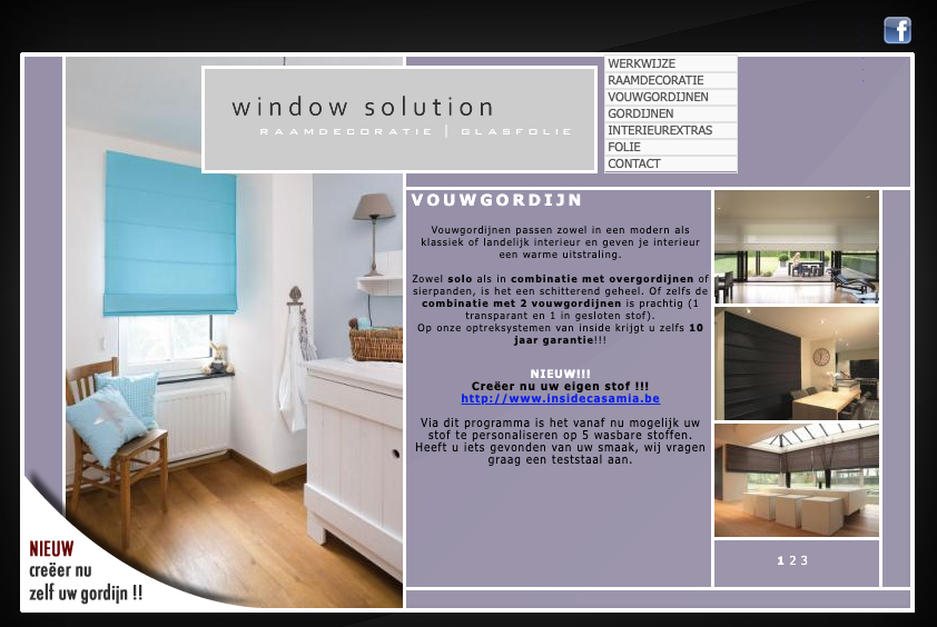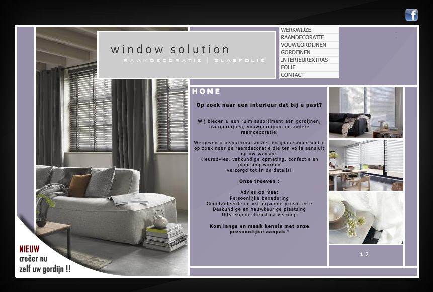 Window Solution biedt zijn klanten een ruim assortiment aan van oplossingen voor raamdecoratie : gordijnen, overgordijnen, vouwgordijnen en andere raamdecoratie.